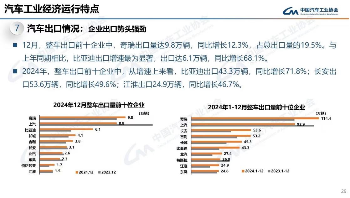 有一项数据特别值得大家关注,据中汽协发布的最新数据显示,2024年我国共出口汽车585.9万辆,同比增长19.3%,可见中国汽车出海迈出了新步伐。其中,比亚迪共出口43.3万辆,位列2024年出口总量第六位,而同比增长率达到71.8%,在整车出口前十企业中,是增速最快的品牌。